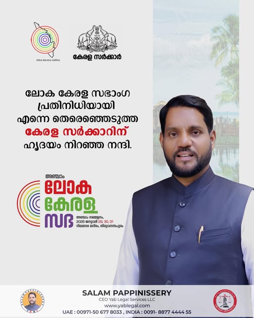 ഷാർജ: യാബ് ലീഗൽ സർവീസസ് സി.ഇ.ഒ സലാം പാപ്പിനിശ്ശേരിയെ അഞ്ചാം ലോക കേരള സഭാംഗമായി വീണ്ടും തിരഞ്ഞെടുത്തു. മുൻ സമ്മേളനങ്ങളിലും സജീവ സാന്നിധ്യമായിരുന്ന അദ്ദേഹത്തെ, പ്രവാസലോകത്ത് മലയാളികൾക്കായി തുടർച്ചയായി നടത്തുന്ന നിസ്തുലമായ നിയമ-സാമൂഹ്യ സേവനങ്ങൾ പരിഗണിച്ചാണ് സർക്കാർ വീണ്ടും സഭയിലേക്ക് നാമനിർദ്ദേശം ചെയ്തത്.